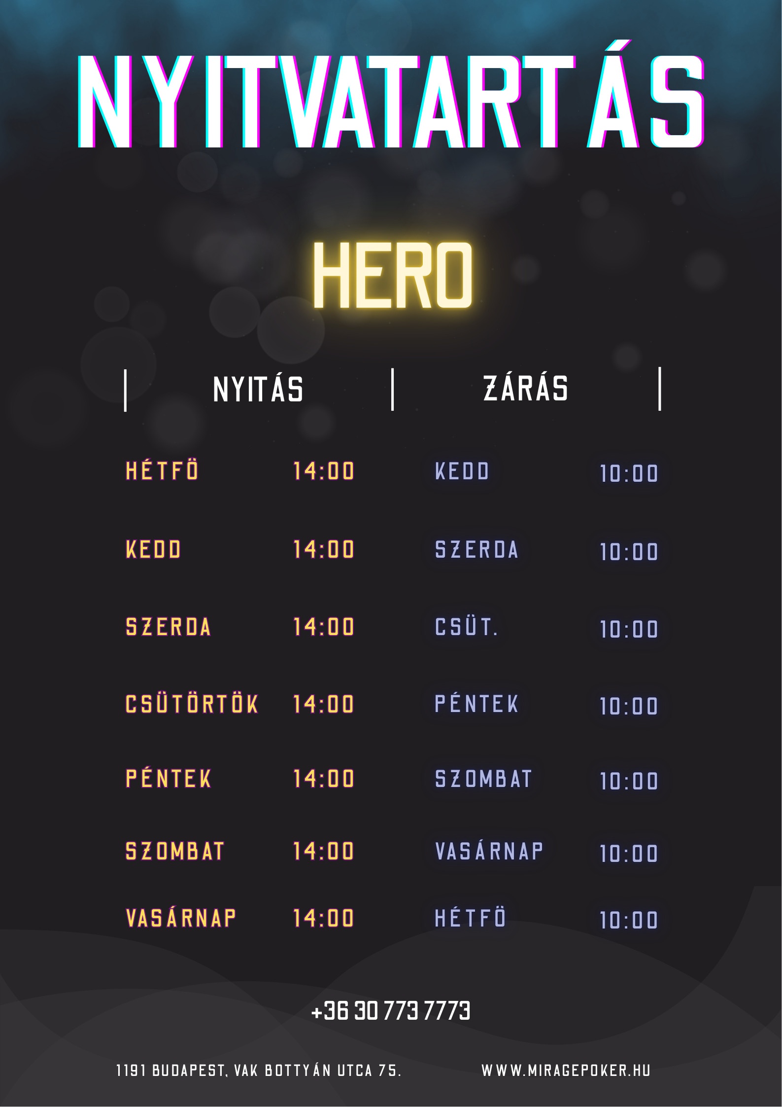 Friday, Saturday and Sunday (Day 1 "B", Day 1 "D" and Day 1 "F") 18:30: 25,000 HUF 1 Re-Entry 40k-40k starting chip amount, 25-minute blind levels.